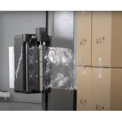 Comprende inoltre 1 gruppo di taglio automatico per tagliare il film a fine ciclo e 1 telecomando per consentire all’operatore di avviare la macchina stando seduto sul carrello elevatore. L’unica situazione non ottimale per questo sistema è lavorare in un luogo con vento, esempio all’aperto.